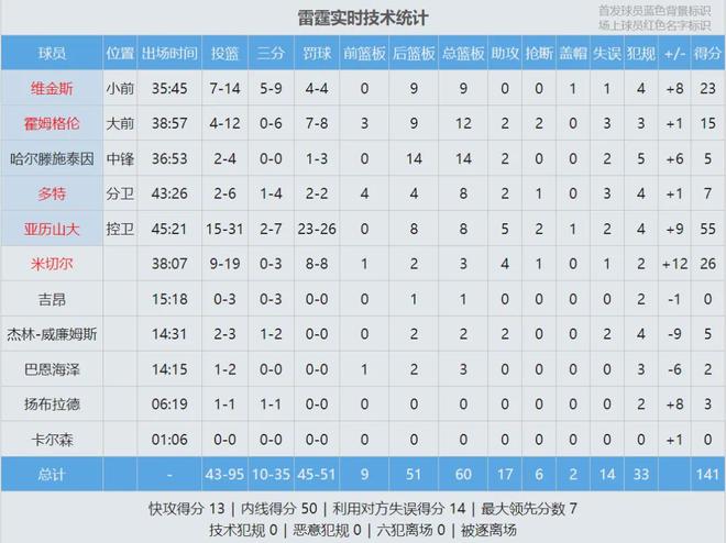 今天上午结束的另外一场NBA常规赛:雷霆历经双加时,最终141-135击败步行者。哈利伯顿和杰威缺阵,亚历山大出战45分21秒,投篮31中15,三分7中2,罚球26中23,狂轰55分8篮板5助攻2抢断1盖帽,正负值+9。